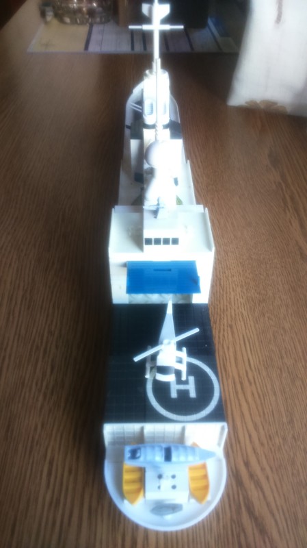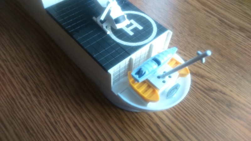 No puede bajarse la estructura en la popa por el portón. Y si bajo la pista, el aterrizaje es molestado por la zona de botes. Ademas el barco no es un combatiente de 1ª sino un barco de apoyo y con mucho almacenamiento.