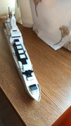 Esta es una nave de batalla, la más moderna de la RNS, con armamento exclusivo de misiles, de los que tiene 8 sistemas, 4 antiaereos (2 en proa, 1 lateral y otro en popa. Los dos últimos son dobles) y otros 4 en la joroba delantera que se ocupan de la superficie y de las profundidades. El portón (Palabra muy de moda) que no existe en la foto es blanco y su heli es ahora uno pesado.